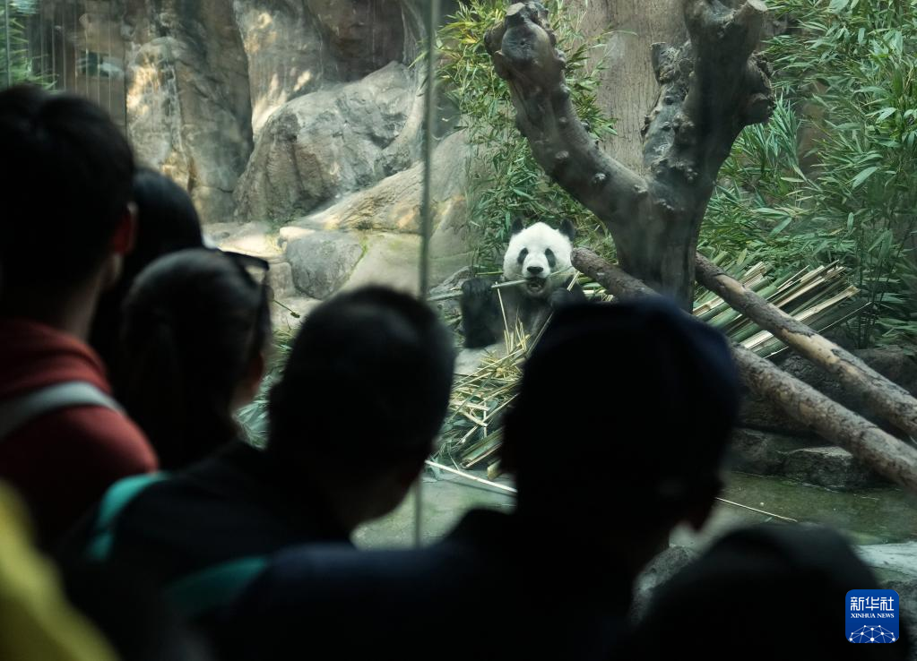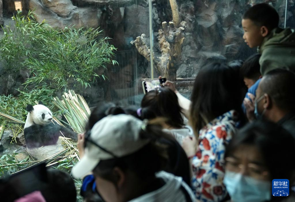4月30日,游客在北京动物园大熊猫馆观赏大熊猫。