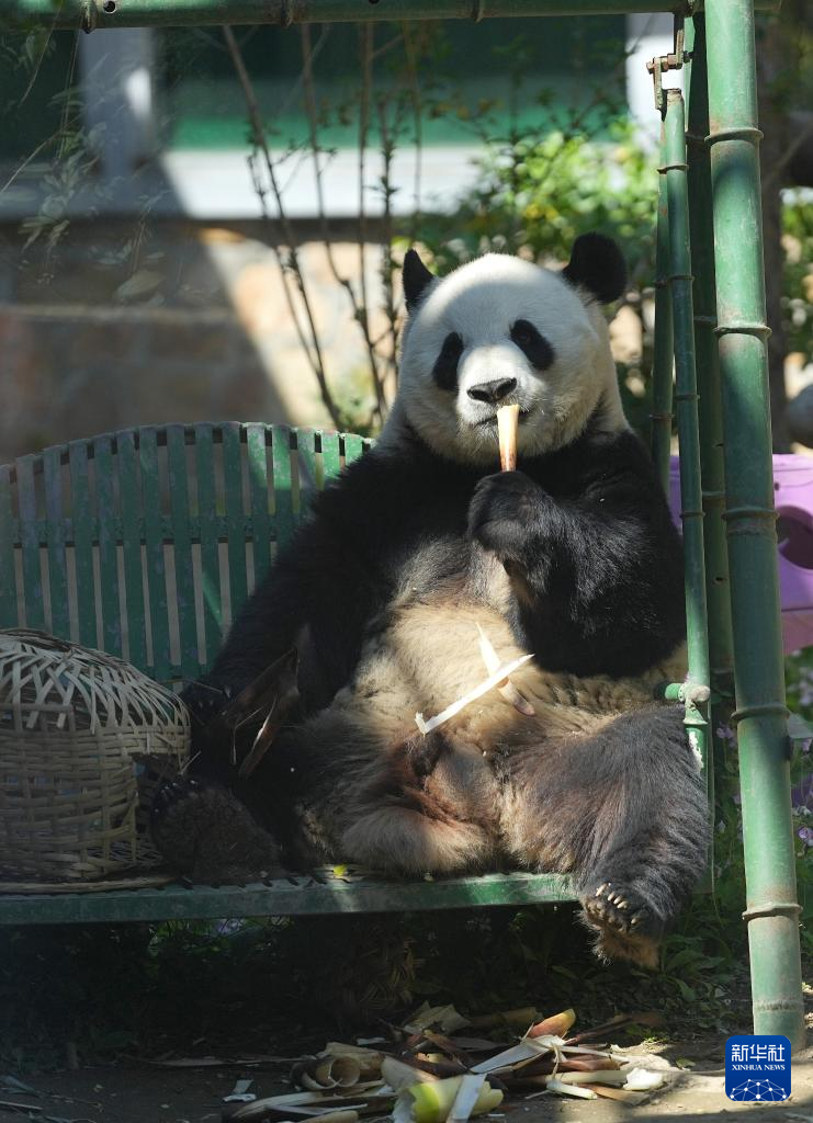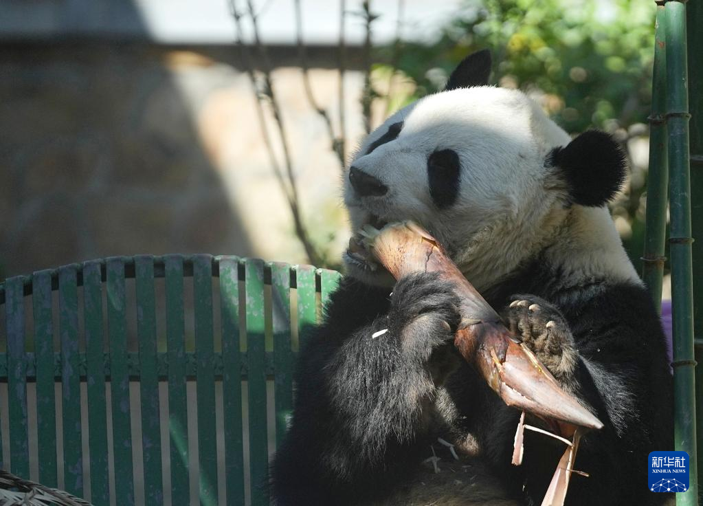 4月30日,在北京动物园大熊猫馆,大熊猫“萌兰”在吃竹笋。