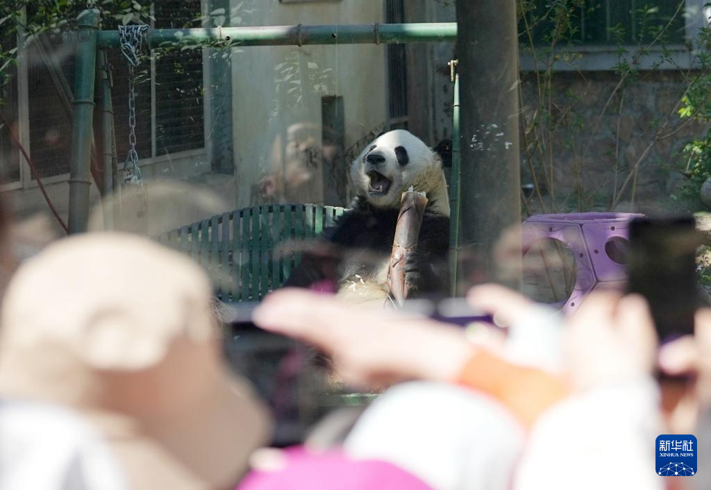 4月30日,游客在北京动物园大熊猫馆观赏大熊猫“萌兰”吃竹笋。