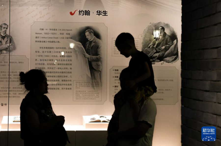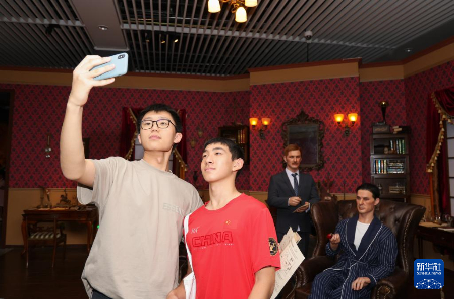 8月20日,两名学生在“福尔摩斯大型沉浸式主题展”上与人像合影。