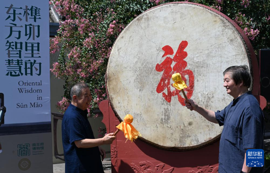 8月21日,京作硬木家具制作技艺国家级代表性传承人种桂友(左)、明式家具制作技艺国家级代表性传承人许建平共同为展览击鼓开幕。