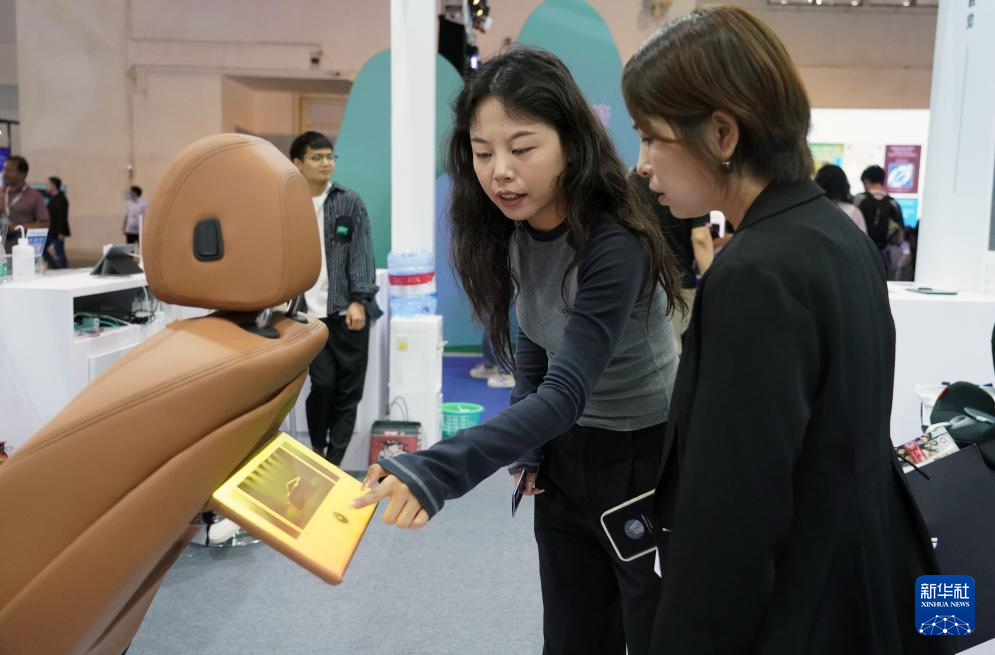 8月26日,工作人员(左)在HICOOL2023全球创业者峰会展览展示区向观众介绍智能座舱。