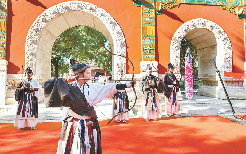 昨天下午,在国子监太学门琉璃牌楼前,来自清华大学礼射研习会的9位同学带来周代乡射礼复原展示,吸引游客驻足观看。现场,展示者身着古代服饰,持弓射箭,每射中一箭,报靶者就会摇旗高喊,报告中靶情况。“乡射礼是盛行于周代的国家礼仪之一,每逢春秋两季,每一个乡、州都要举行乡射礼,乡长或州长会作为主人集合士人民众在乡校习射,通过讲习礼让进退之仪来教化民众,并将射艺精湛且德行高尚的人士举荐给国家。”研习会相关负责人说。未来3天,国子监里将开展2场学术讲座和20场主题报告,以及一场中国古代服饰复原研究成果展示秀。