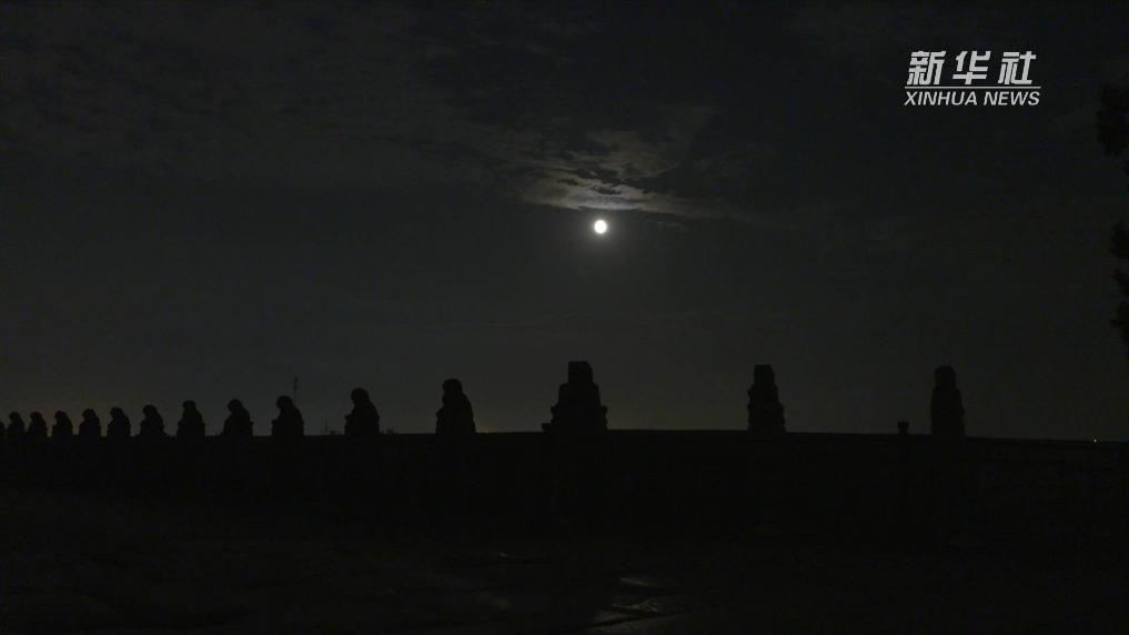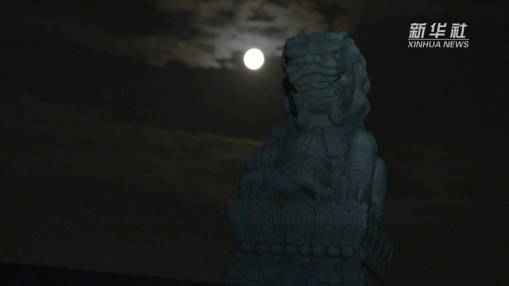 8月30日晚,在北京、宁夏等地,镜头捕捉到一轮明月悬挂夜空,与地面景象相映成趣的画面。