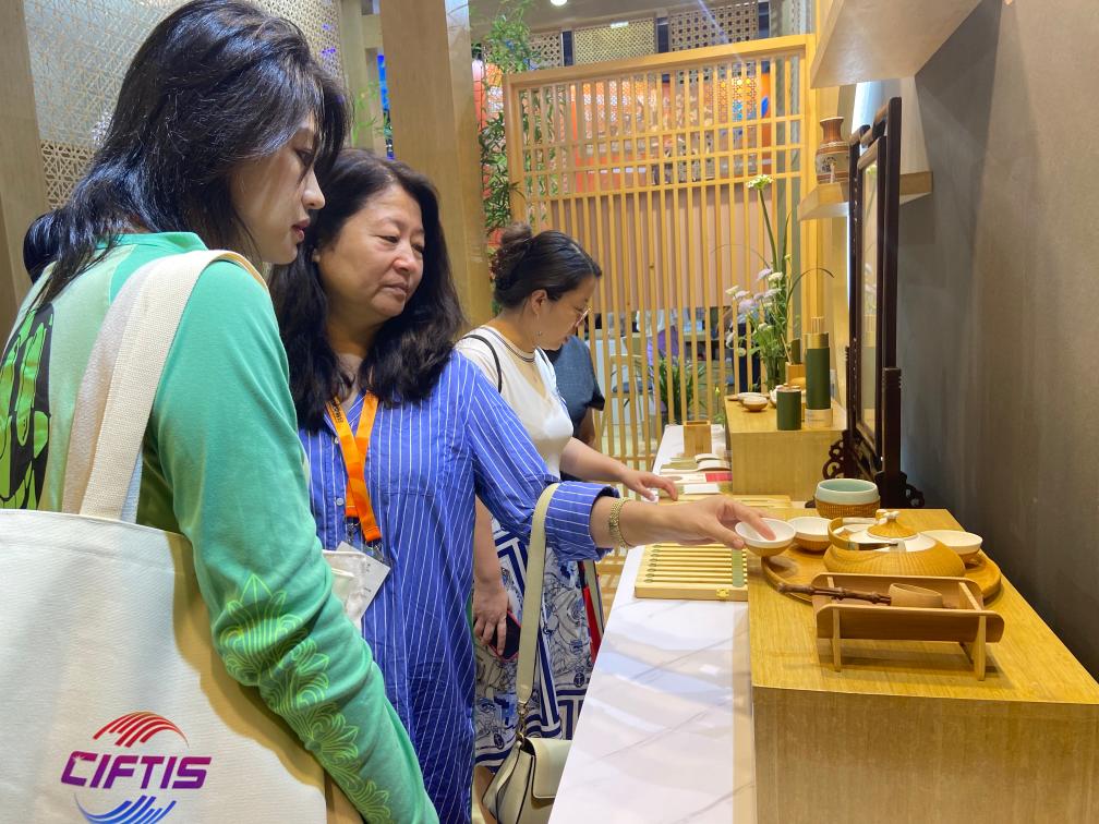 图为国际竹藤组织展台上展出的竹制产品。新华社记者魏梦佳摄