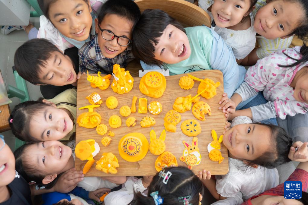 9月28日,在北京西城区的北京第二实验小学涭水河分校,小学生展示各种奇思妙想的“粘土月饼”。