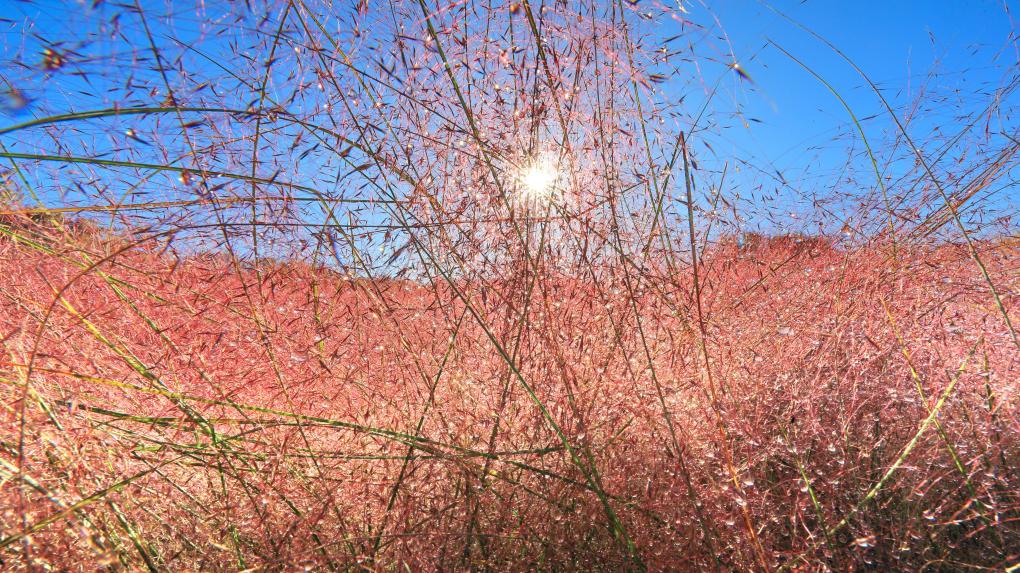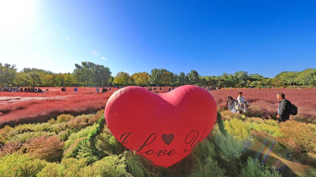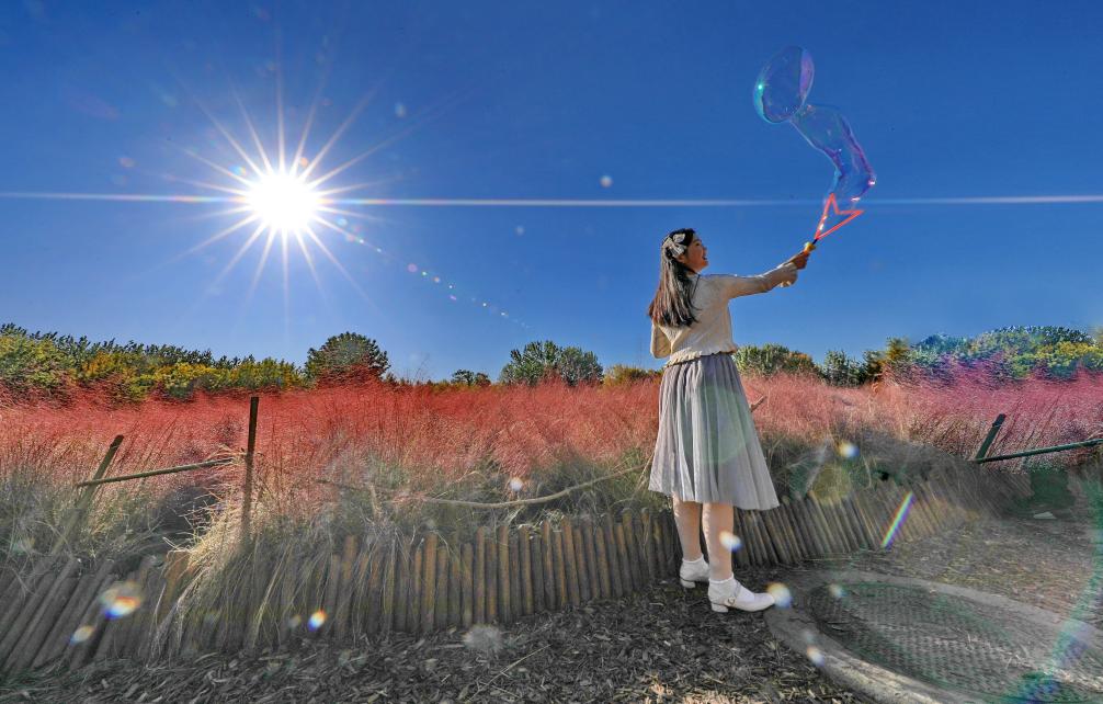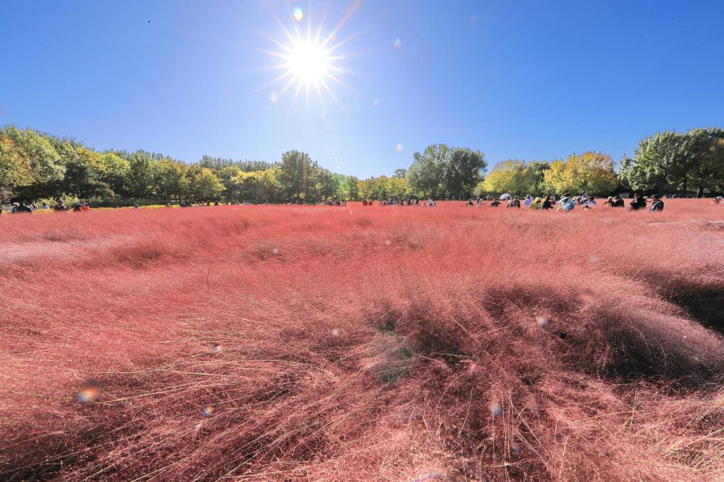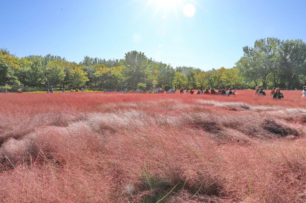 金秋时节,北京奥林匹克森林公园的粉黛乱子草进入观赏季,“粉色花海”吸引游人前来观赏拍照。