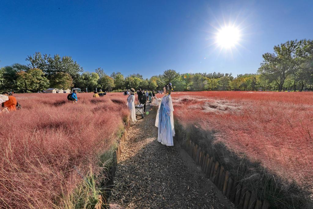 2023年10月14日,游人在北京奥林匹克森林公园粉黛乱子草花海中游玩。CICPHOTO/刘宪国 摄
