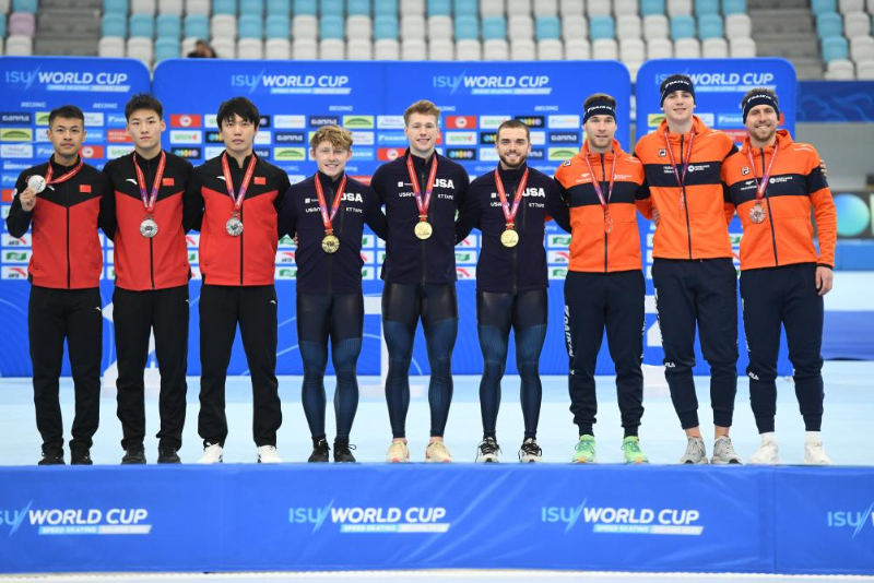 11月18日,冠军美国队(中)、亚军中国队(左)与季军荷兰队在颁奖仪式上。当日,在2023-2024赛季国际滑联速度滑冰世界杯(北京站)男子短距离团体追逐赛A组比赛中,中国队获得亚军。新华社记者 鞠焕宗 摄