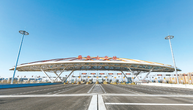 沿着新建高速,向西五环方向行驶,一座带有橘黄、银色相间棚顶的收费站腾空而起。收费站外观设计以白洋淀、永定河“水”文化为灵感,空中俯瞰犹如一条锦鲤,寓意鱼跃龙门,鹏程万里(鲤)。由远及近,“房山北站”四个红色大字映入眼帘,20条车道一字排开,十分气派。此时,各条车道的收费岗亭、ETC计费设备、显示屏均已完成安装,具备通车使用条件。