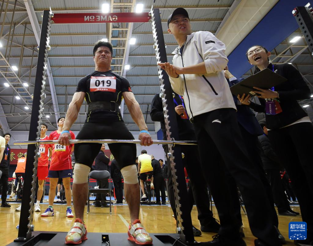 12月29日,国家举重队队员李发彬(左)在大腿中部拉项目测试中。