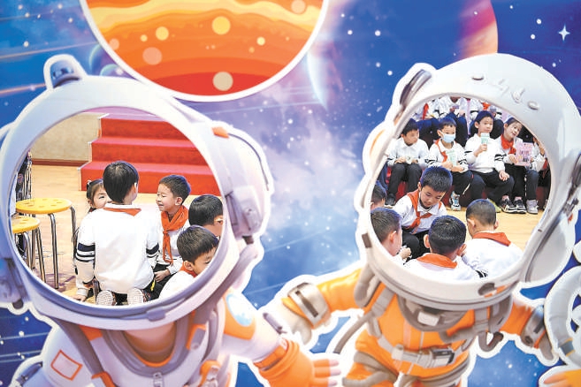 亦庄第二小学二年级以“对话天宫”为主题的学业成果展示中,学生们阅读航天知识相关短文,向航天员说说心里话,欣赏美丽的太空图片,在轻松快乐的氛围里完成“乐考”。本报记者 和冠欣摄