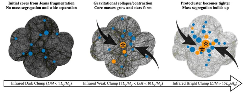 论文第一作者、北京大学物理学院天文学系博士研究生许峰玮介绍,分子云是星系中较冷较致密的气体凝结体,是恒星形成的温床。观测显示,分子云中的高密度云核在引力作用下,通过坍塌、收缩和分裂,最终形成了原始的恒星,即原恒星。而大量相互间存在引力作用的原恒星组合成群则形成了原恒星团。在持续坍塌和收缩效应下,原恒星团变得更加紧密。