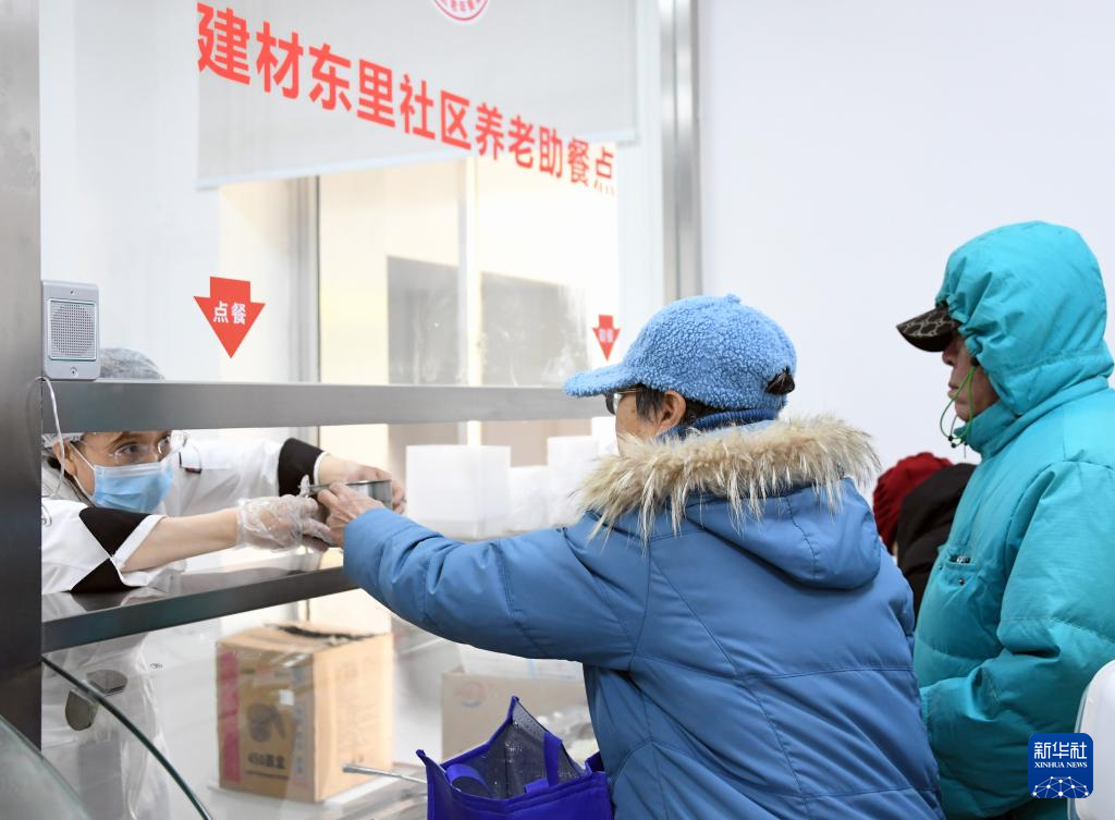 1月16日,老人在北京市海淀区西三旗街道建材东里社区养老助餐点购买午餐。