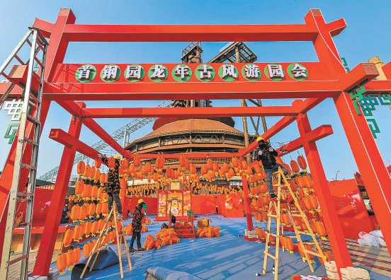 昨天下午,位于三高炉南广场上,首钢“集”祥——龙年古风游园会完成最后的展台搭建工作。抬头望去,一串串的大红灯笼高高悬挂,在春节期间的夜晚将点亮三高炉区域。