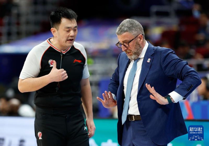 3月20日,北京北汽队主教练乔里欧·格里乔里(右)在比赛中与裁判员交流。