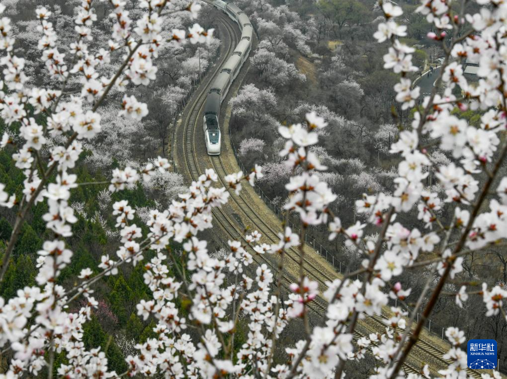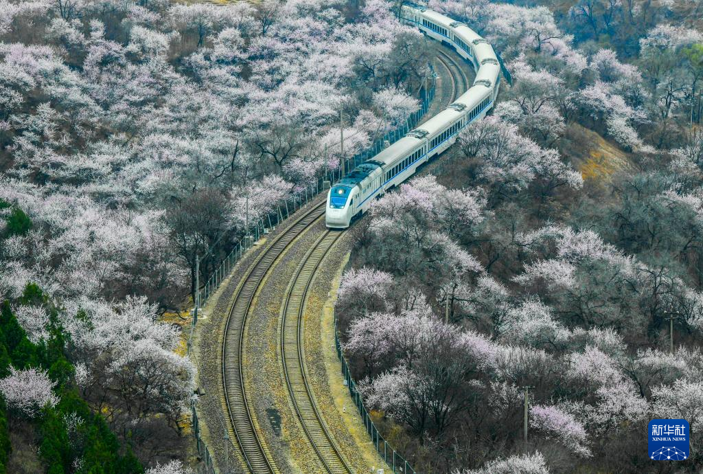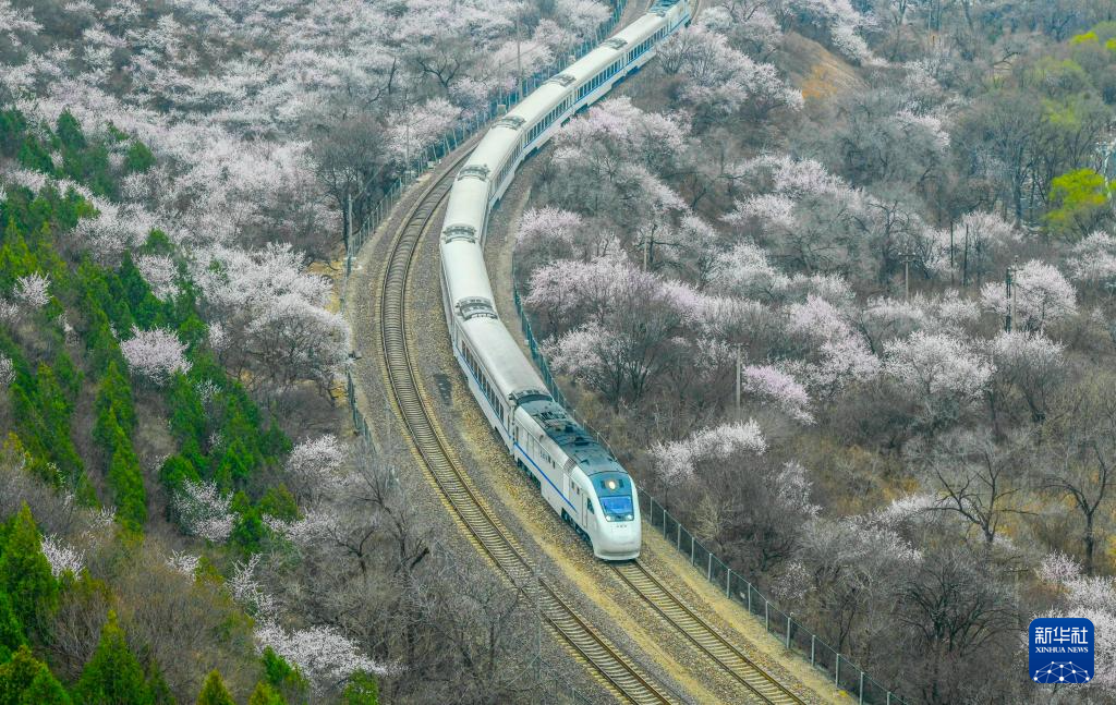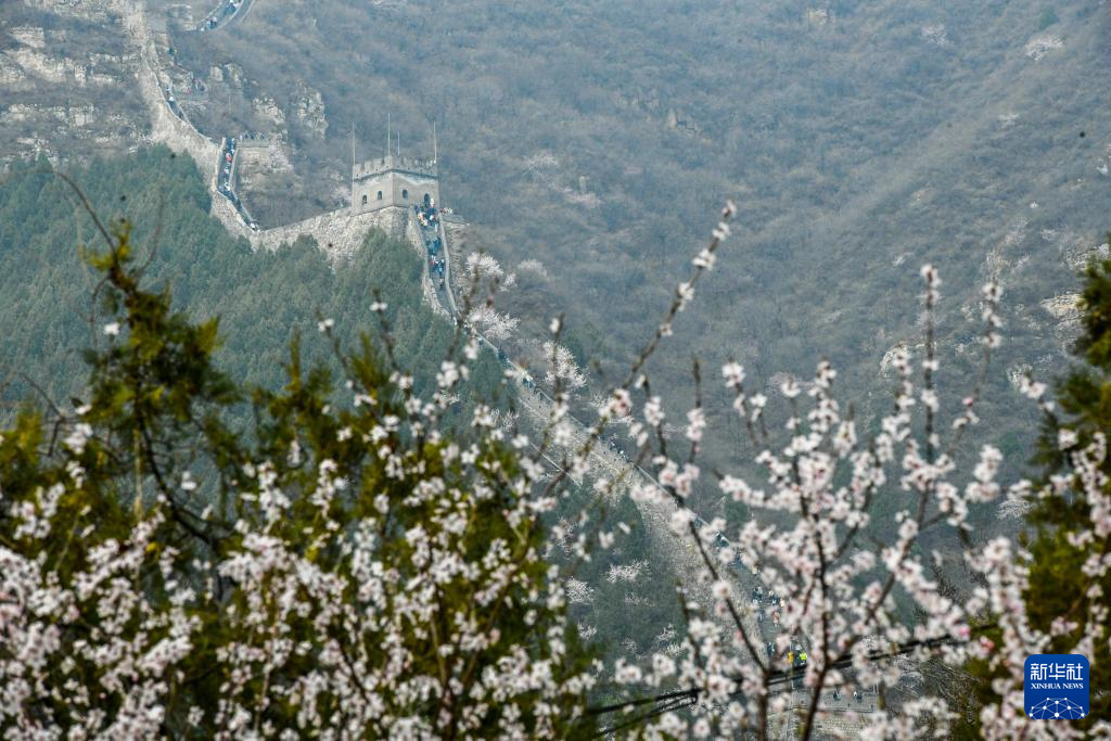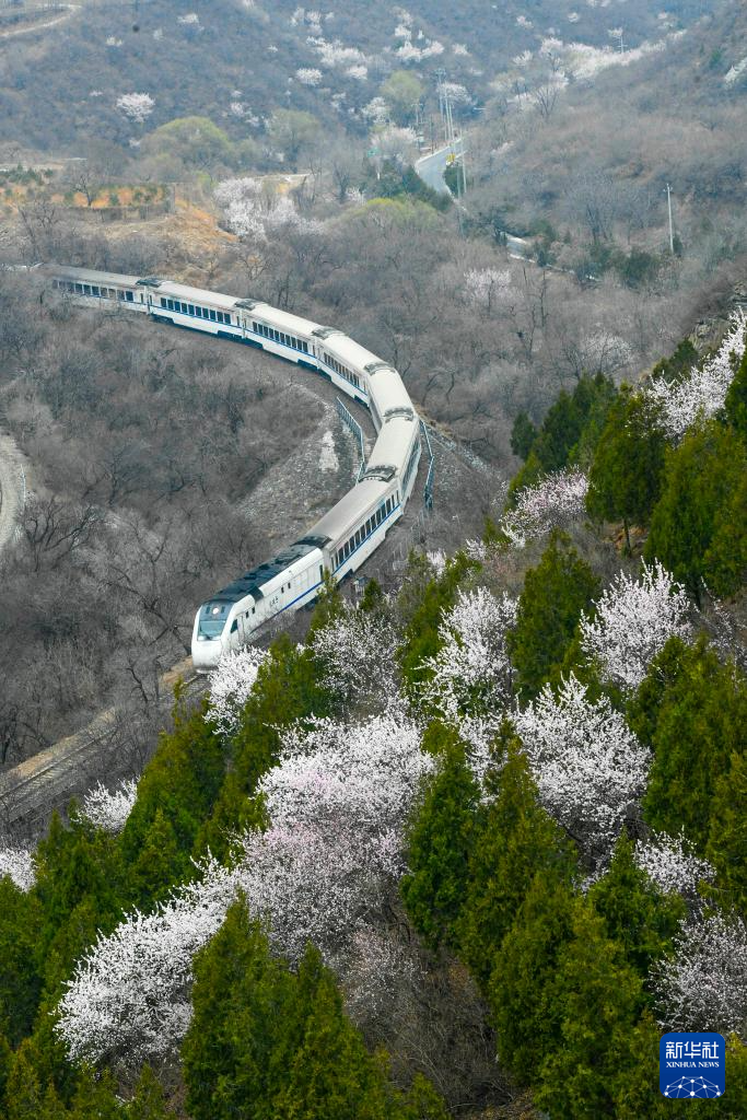 近日,北京市居庸关长城景区山桃花开,花海中的列车、长城上的游客与春景,勾勒出一幅幅美丽的画卷。