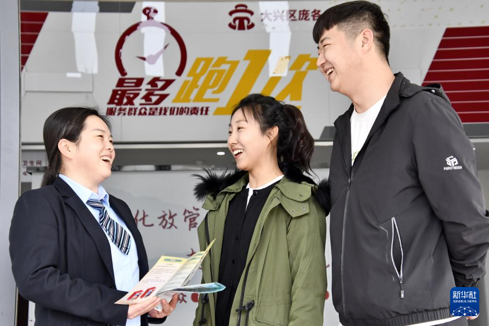 3月25日,庞各庄镇政务服务中心的工作人员在为群众介绍便民服务措施。