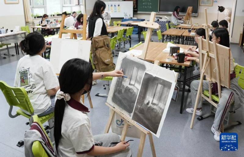 北京中学的学生在课余时间参加美术兴趣小组(5月8日摄)。