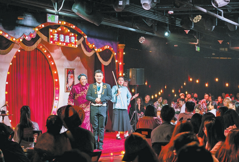 “三哥您来啦?好久没见着您了!”随着演出的开始,不断有观众被随机选为配合剧情发展的“客串角色”,无厘头的包袱,不停戳中观众笑点。席间还有魔术、歌舞,以及精心准备的餐食和换装饰品,为观众带来一次复古宴席的沉浸式体验。