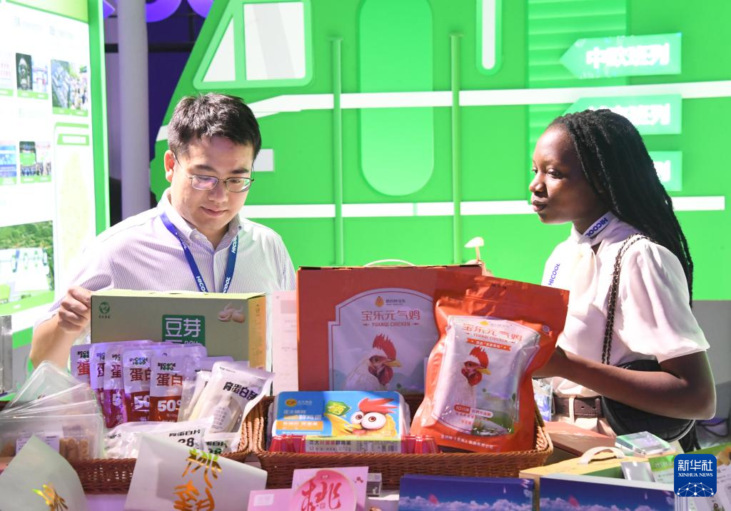 8月23日,工作人员(左)在HICOOL 2024全球创业者峰会展览展示区平谷展位向观众介绍农产品。