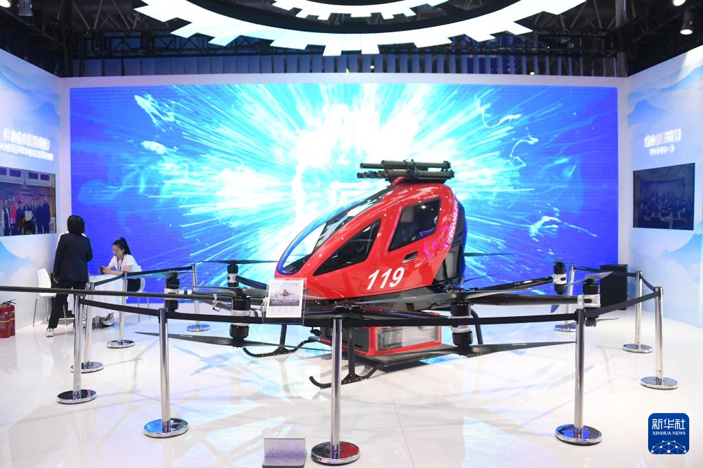 8月23日在HICOOL 2024全球创业者峰会展览展示区拍摄的应用于高层建筑消防灭火的无人驾驶航空器。