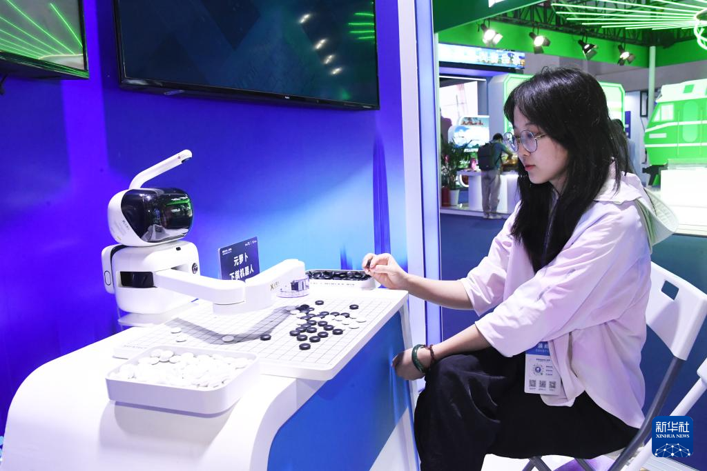8月23日,工作人员在HICOOL 2024全球创业者峰会展览展示区与机器人下棋。