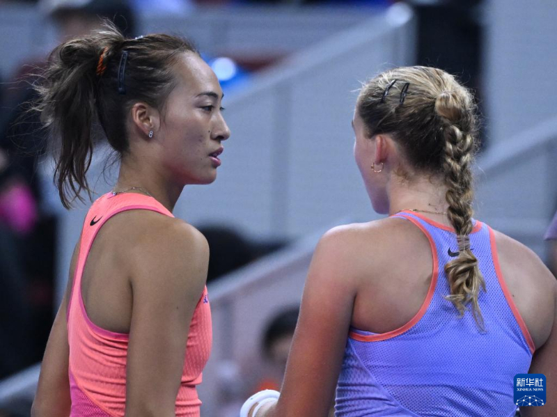 10月4日,郑钦文(左)与米拉·安德烈耶娃在比赛间隙。 新华社记者 张龙 摄