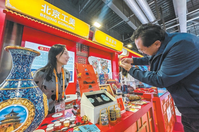 第七届进博会上,北京工美集团的中轴线主题文创产品丰富精美,吸引参观者关注。 实习记者 金瑶摄