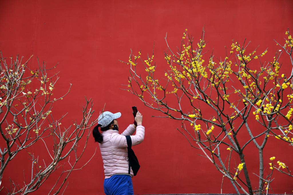 2025年3月4日,北京市海淀区,游客在国家植物园卧佛寺内拍摄绽放的蜡梅。CICPHOTO/樊甲山 摄