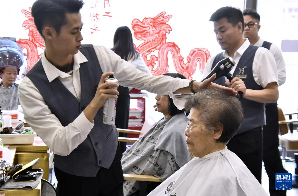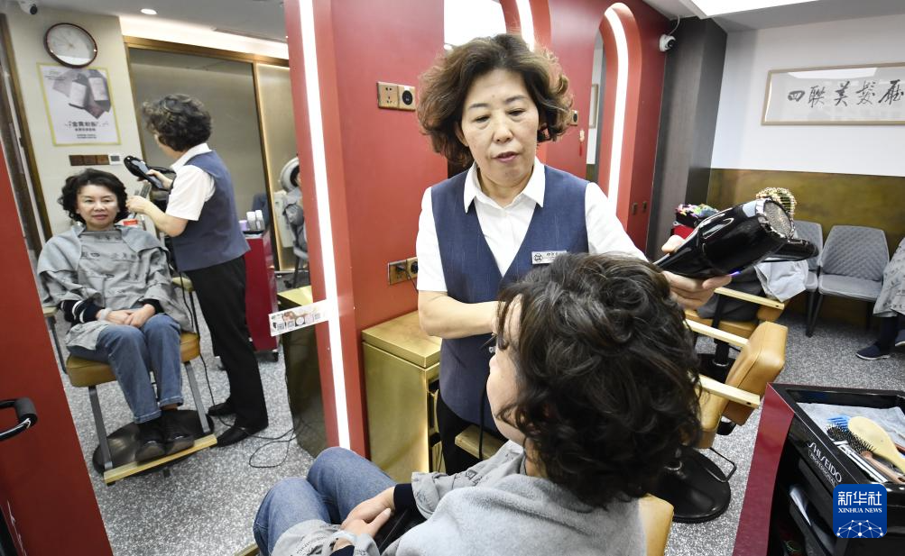 3月30日,在四联美发工作了45年的高级美发技师归秀凤为顾客美发。