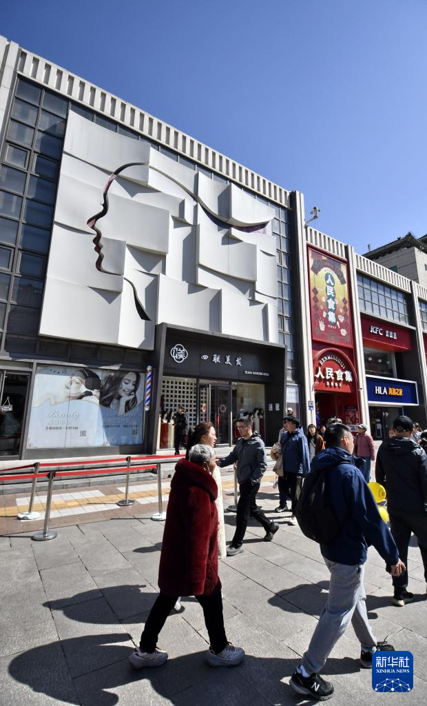 3月30日,游人从王府井商业街的四联美发店前走过。