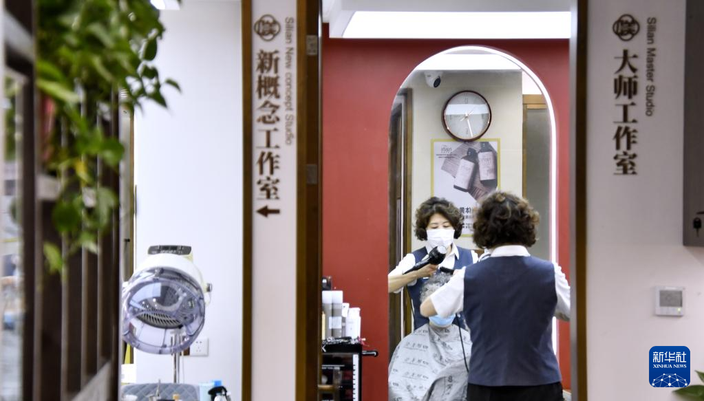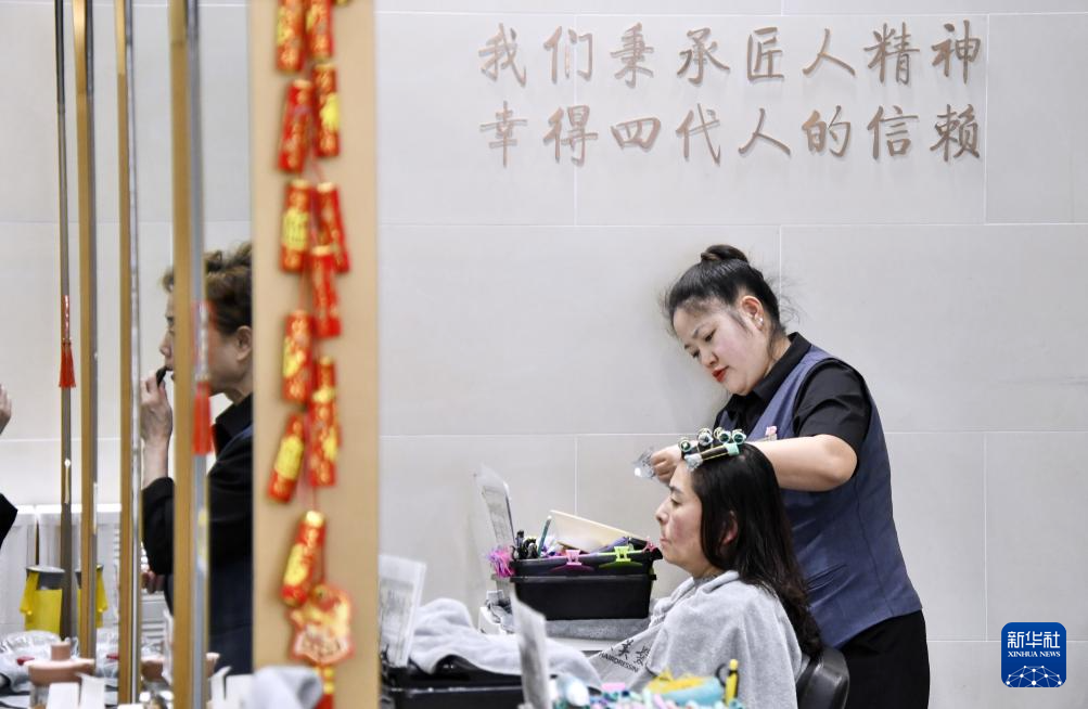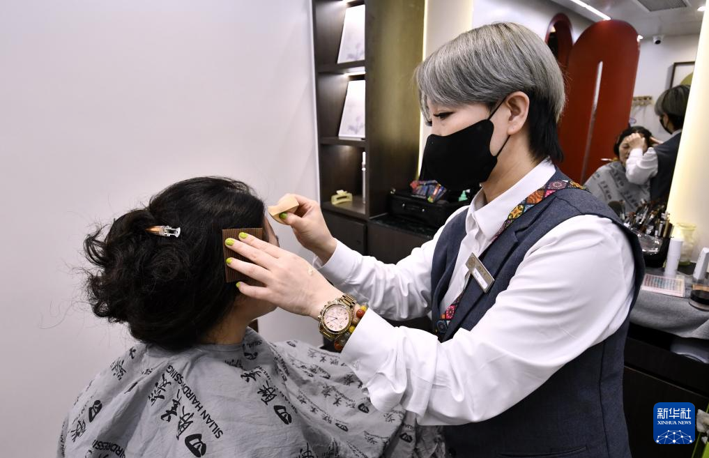 3月20日,归秀凤在四联美发王府井店的大师工作室内为顾客美发。