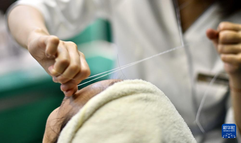 3月20日,四联美发王府井店的技师在用传统的“绞脸”技艺为顾客做面部美容。