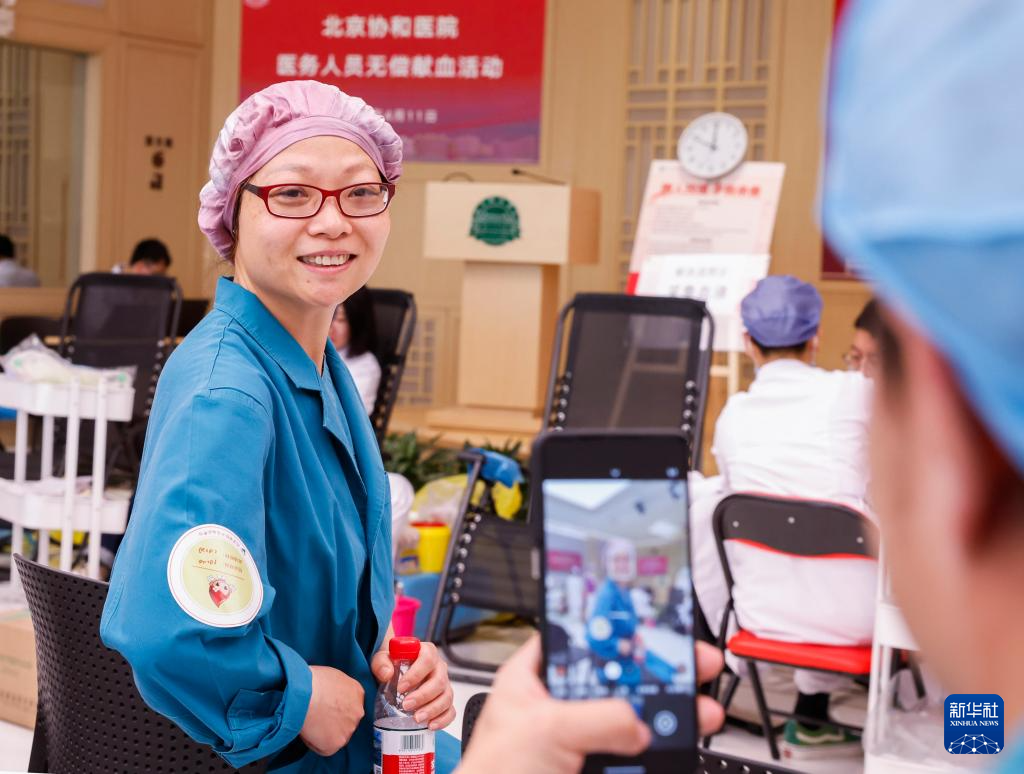 4月11日,一位北京协和医院的医务人员在献血后拍照留念。