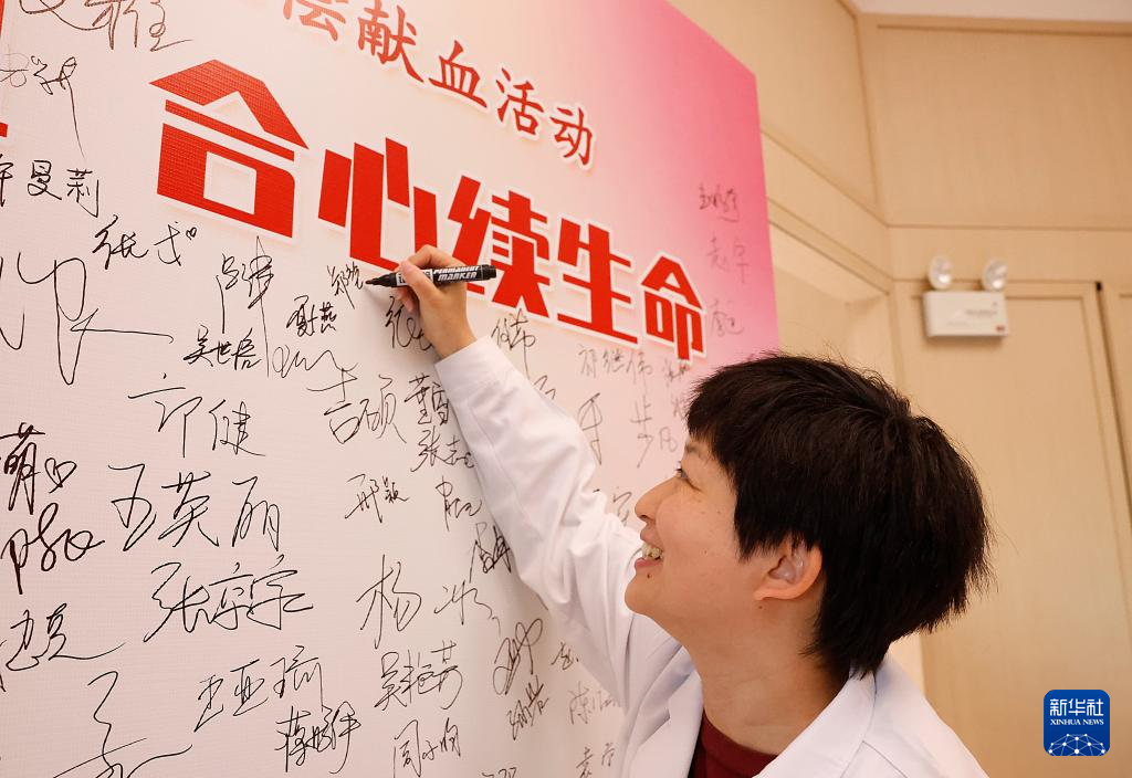 4月11日,一位北京协和医院的医务人员在献血前签名留念。