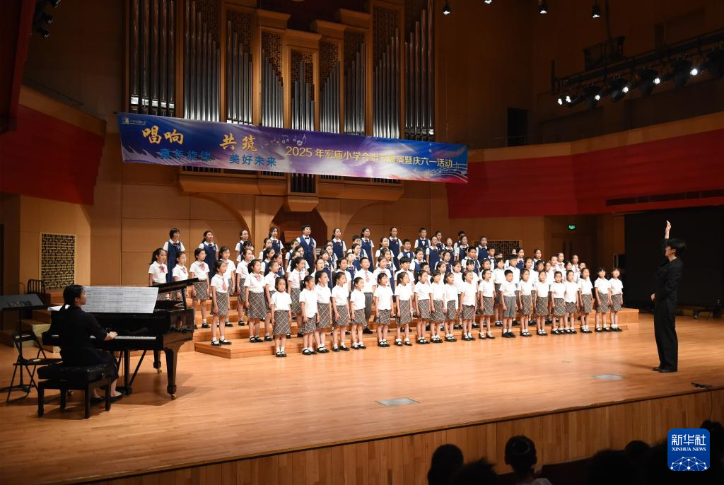 5月29日,北京市西城区宏庙小学学生在2025年宏庙小学合唱节展演暨庆六一活动中演唱歌曲。