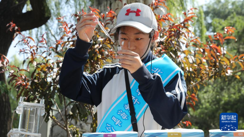 6月2日,在北京什刹海景区,北京四中(北海校区)的学生志愿讲解员现场检测什刹海水质。