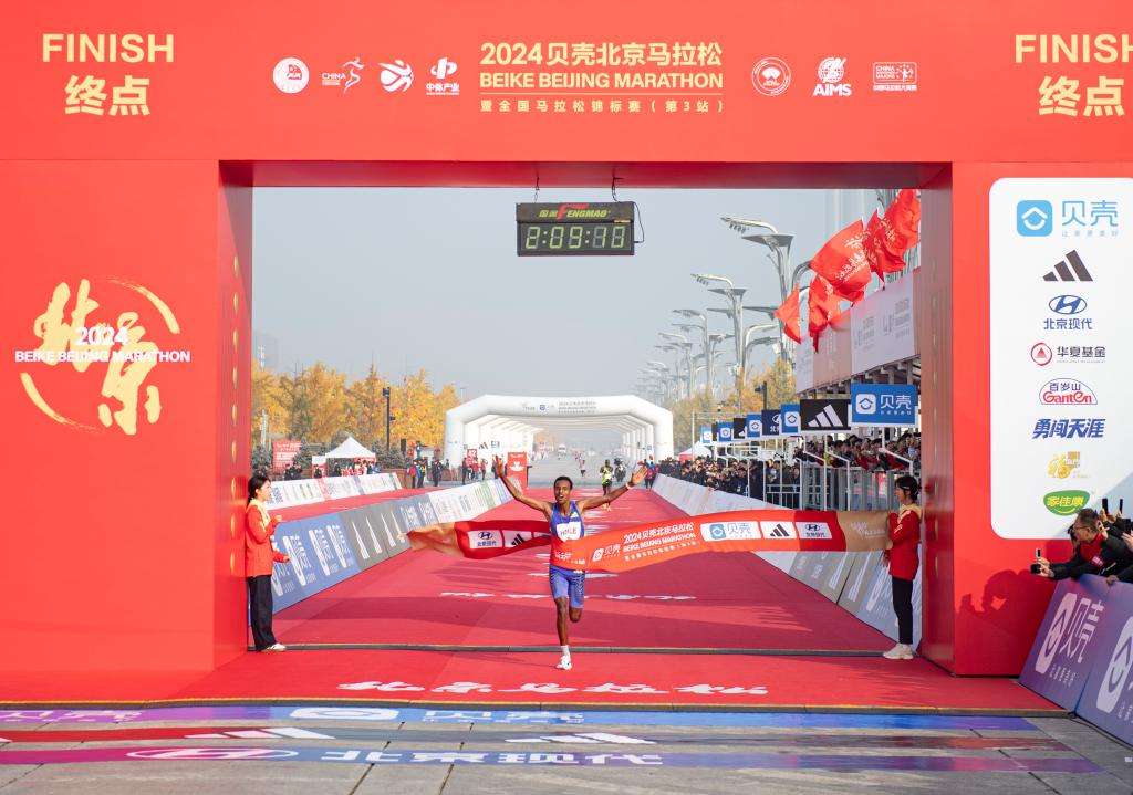 2024年11月3日,获得冠军的埃塞俄比亚选手海勒冲过2024北京马拉松终点线。新华社记者 陈钟昊 摄