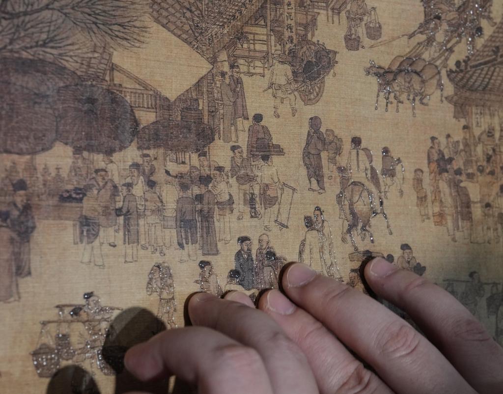 10月13日,视障人士在发布会后,欣赏无障碍版《触摸<清明上河图>》。