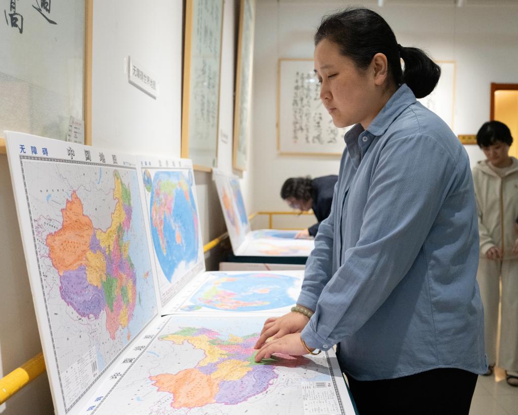 10月13日,视障人士在发布会后,触摸盲文版《无障碍中国地图》。