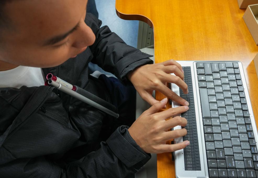 10月13日,视障人士在发布会后,体验有点显器的盲文笔记本电脑。 记者:才扬、殷刚