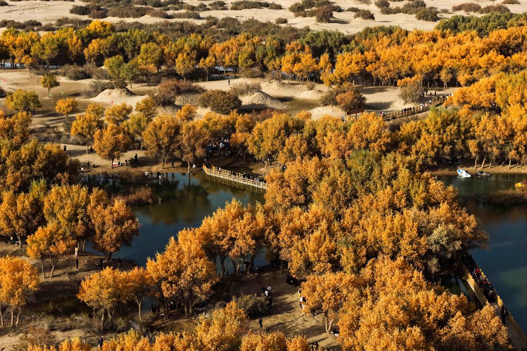 游客在新疆和田地区洛浦县洛滨胡杨林景区游览(无人机照片,10月19日摄)。时下,新疆和田地区的胡杨迎来最佳观赏期,成片换妆的胡杨林与水天相映,共绘金秋美景。新华社记者 辛悦卫 摄