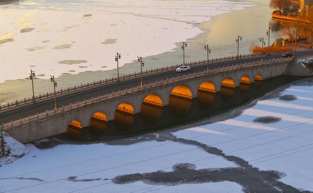 近日,在甘肃省张掖市甘州区滨河新区九孔桥拍摄的“金光穿洞”景观(无人机照片)。冬日时节,各地美景缤纷如画,吸引众多游客赏景游玩。新华社发(陈礼摄)