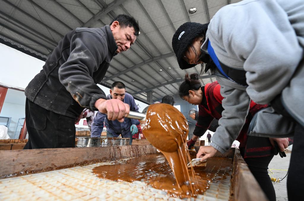12月20日,积善村村民将红糖倒入模具中。每年冬至前后,福建省将乐县积善村的村民都会忙着收割甘蔗,熬制红糖。对村民来说熬制红糖是祖传的民俗手艺,也是对甜蜜生活的美好寄托。新华社记者 周义 摄
