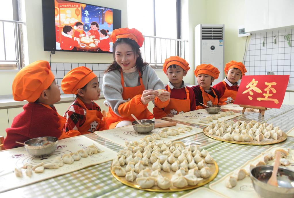 近日,浙江省湖州市德清县乾元镇第一幼儿园小朋友在包饺子。冬至到来之际,各地举办丰富多彩的民俗活动迎接冬至。新华社发(倪立芳摄)