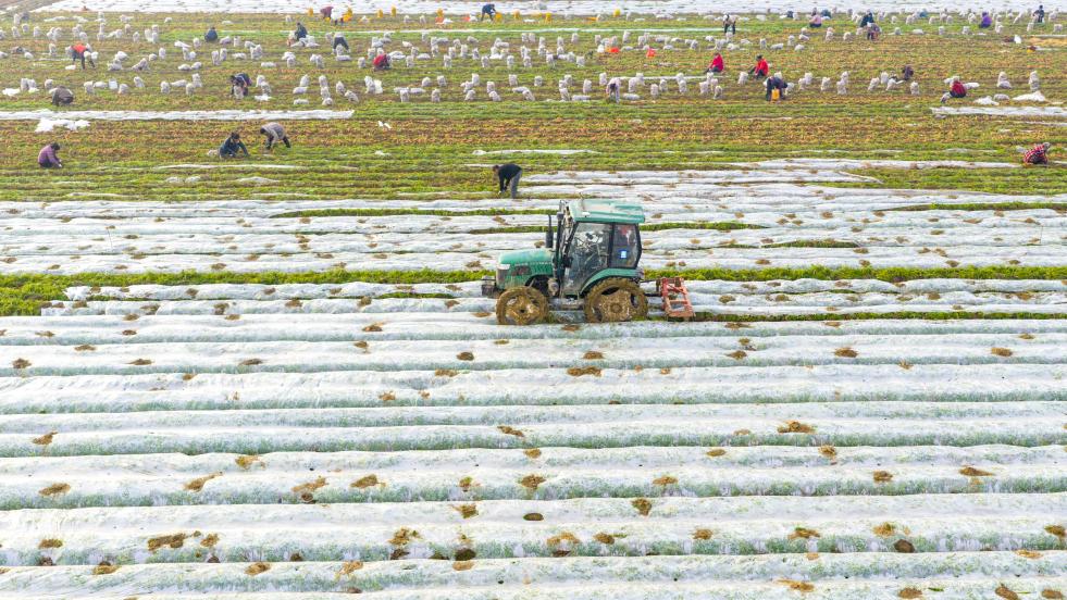 近日,河南省商丘市睢县董店街道赵楼村村民在田间地头采收胡萝卜(无人机照片)。冬日时节,各地农民抢抓农时,积极开展冬季农业生产活动。新华社发(徐泽源摄)
