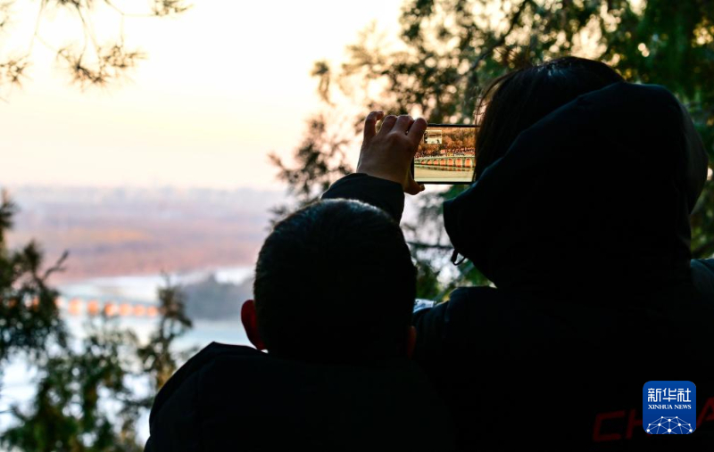 12月21日,游客在颐和园万寿山上拍摄十七孔桥“金光穿洞”美景。