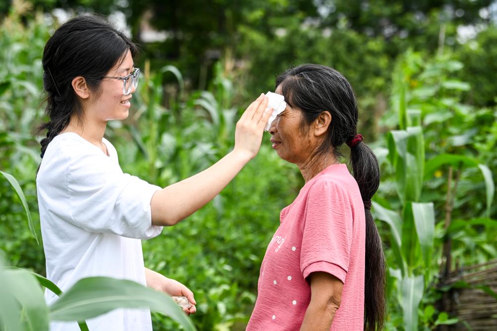 在广西桂林市灌阳县新街镇,刘燕(左)在农忙之余给妈妈擦汗(2025年6月13日摄)。新华社记者 曹祎铭 摄