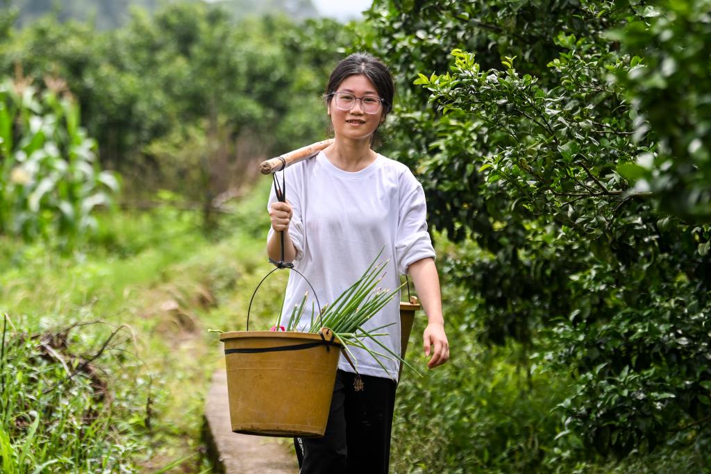 在广西桂林市灌阳县新街镇,刘燕用扁担挑着在自家菜地采摘的蔬菜走在回家路上(2025年6月13日摄)。新华社记者 曹祎铭 摄